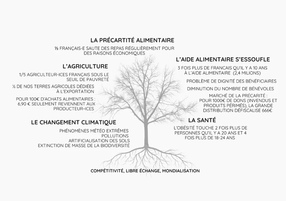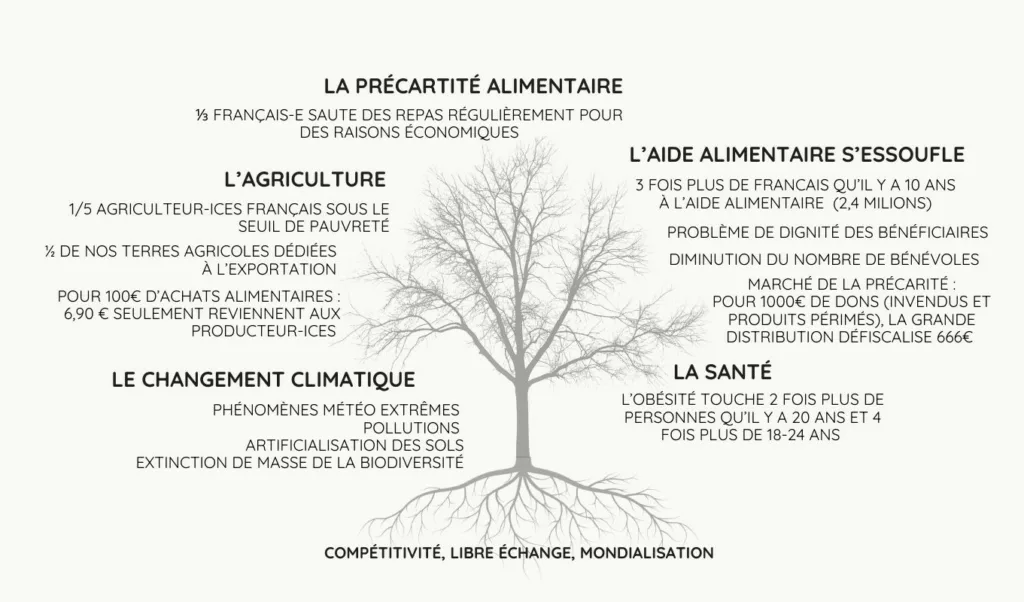Les impacts de notre alimentation sur notre santé, l’explosion de la précarité alimentaire, la difficulté pour les agriculteur-ices de vivre de leur travail et la nécessité de s’adapter aux effets du réchauffement climatique nous poussent à changer de logique en reprenant la main sur notre alimentation !