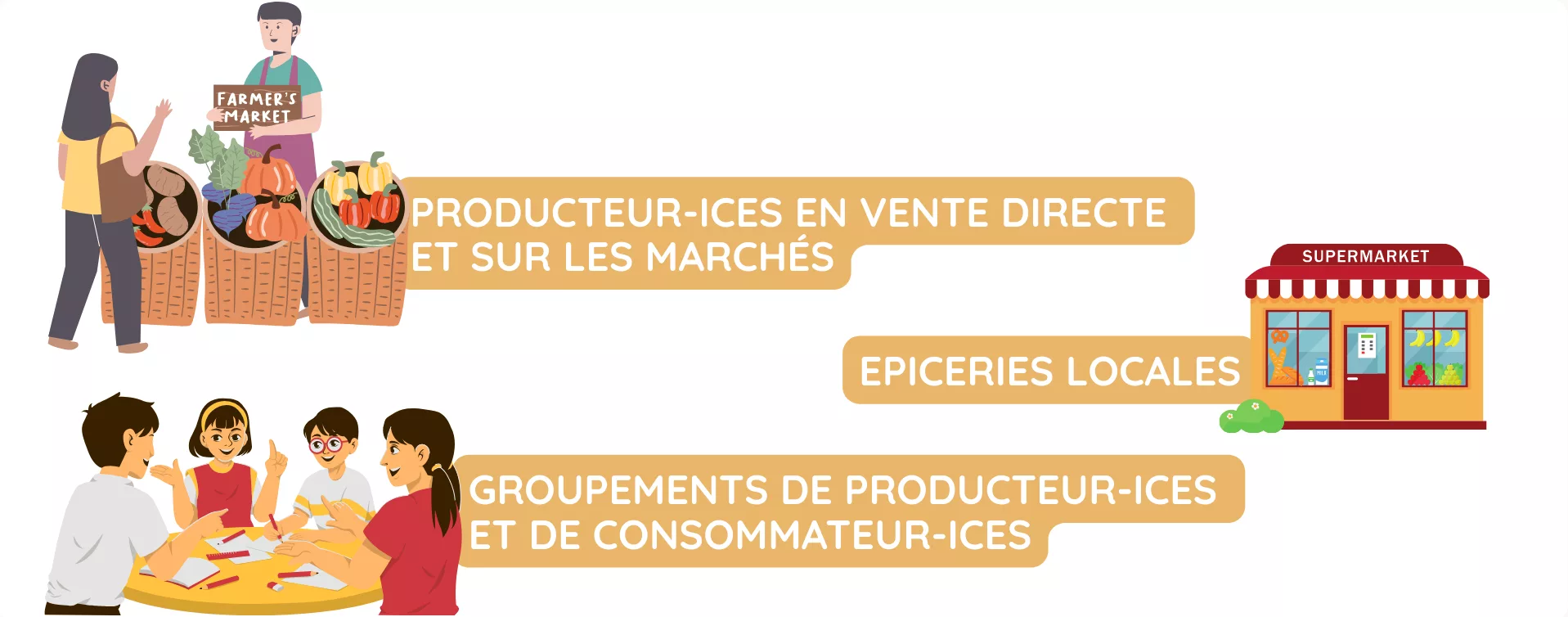 Les productions locales : Fruits et légumes frais de saison, légumineuses, fruits oléagineux, graines herbes et aromates, céréales, produits laitiers, viandes, poissons de pêche de saison et artisanale, poissons d’élevage labelisés bio, …